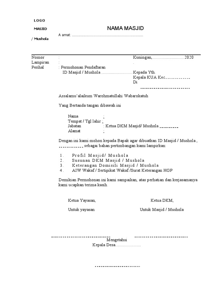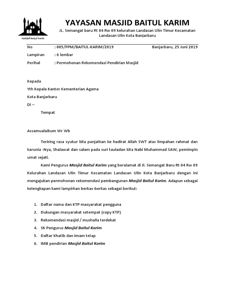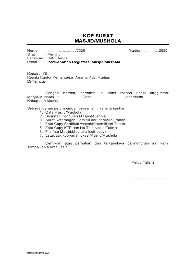 Contoh Surat Pertubuhan Masjid By Coa_353Marvin 19 May, 2022 Post a Comment Surat Rekomendasi Pembangunan Masjid Pdf Contoh Surat Permohonan Skt Masjid Pdf Contoh Surat Takmir Masjid Pdf Surat Permohonan Id Masjid Mushola Pdf 1 Share No comments for "Contoh Surat Pertubuhan Masjid"